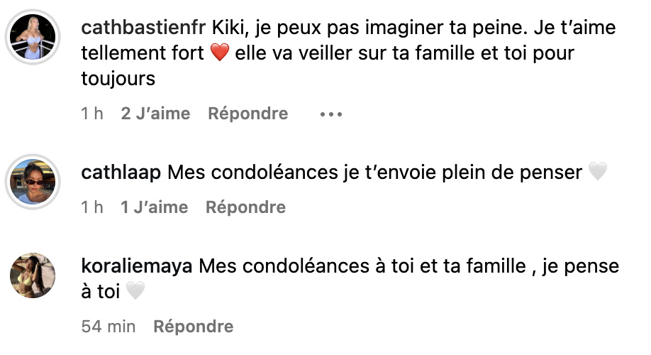 Dans les commentaires, de nombreux internautes ont tenu à inonder Kiana d'amour, lui adressant leurs plus sincères condoléances. Parmi eux, on retrouve notamment Catherine L., Catherine Bastien et Koralie-Maya, trois ex-candidates de téléréalité, venues témoigner de leur soutien et de leur solidarité.