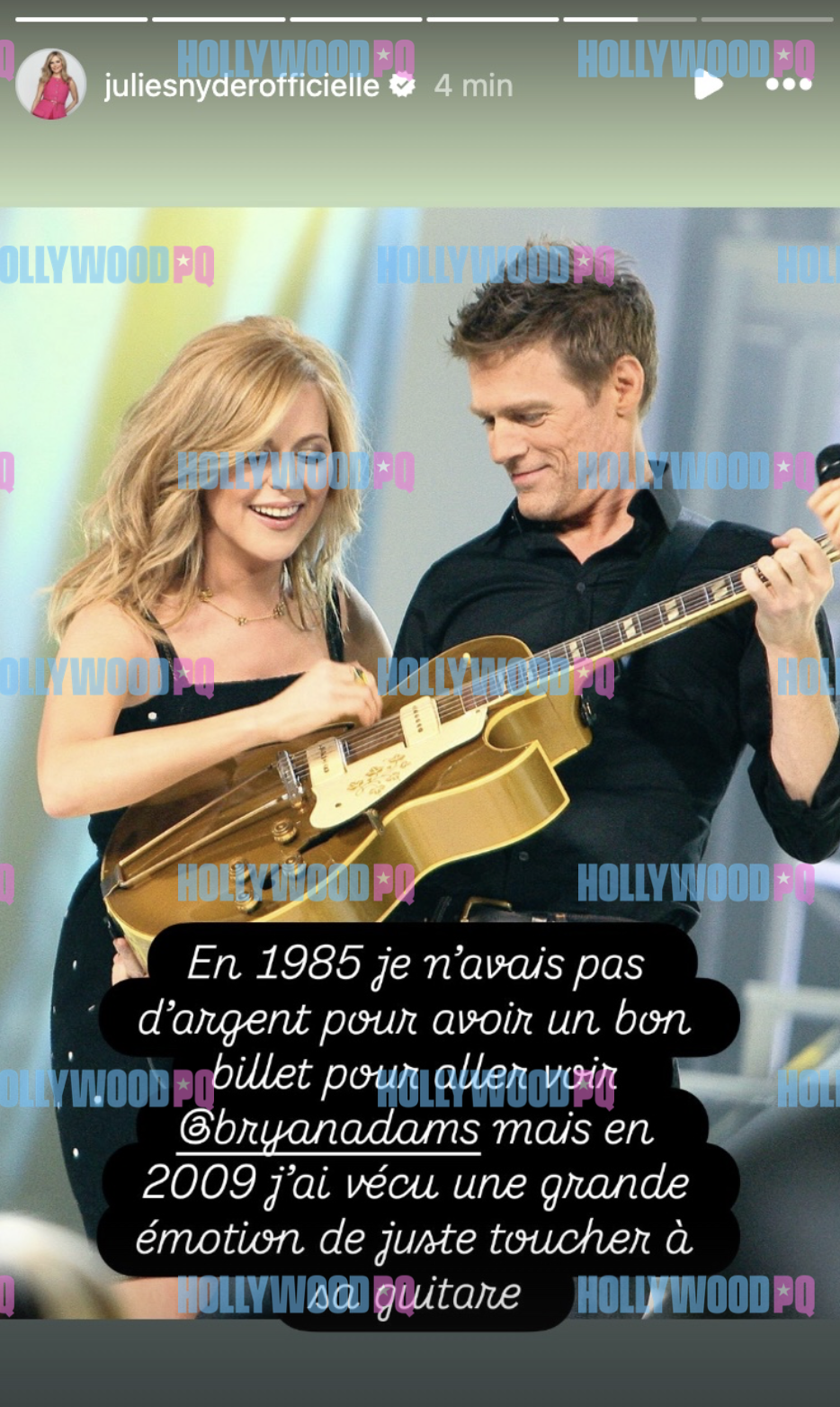 «En 1985, je n'avais pas d'argent pour avoir un bon billet pour aller voir Bryan Adams, mais en 2009, j'ai vécu une grande émotion de juste toucher sa guitare», se remémore-t-elle, en légende d'une autre photo complice où on la voit s'émerveiller devant Adams.