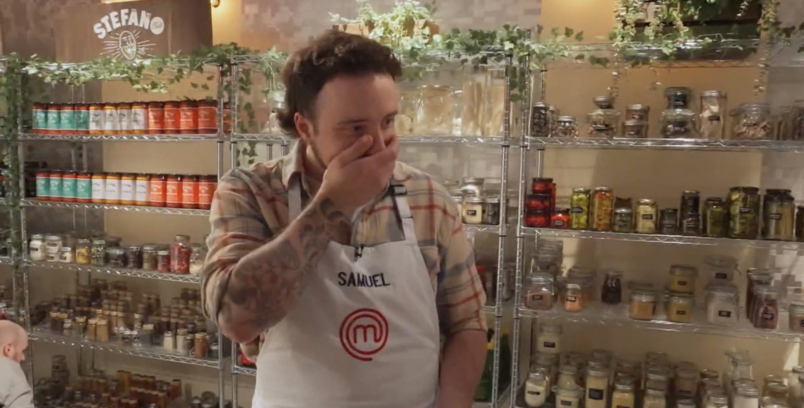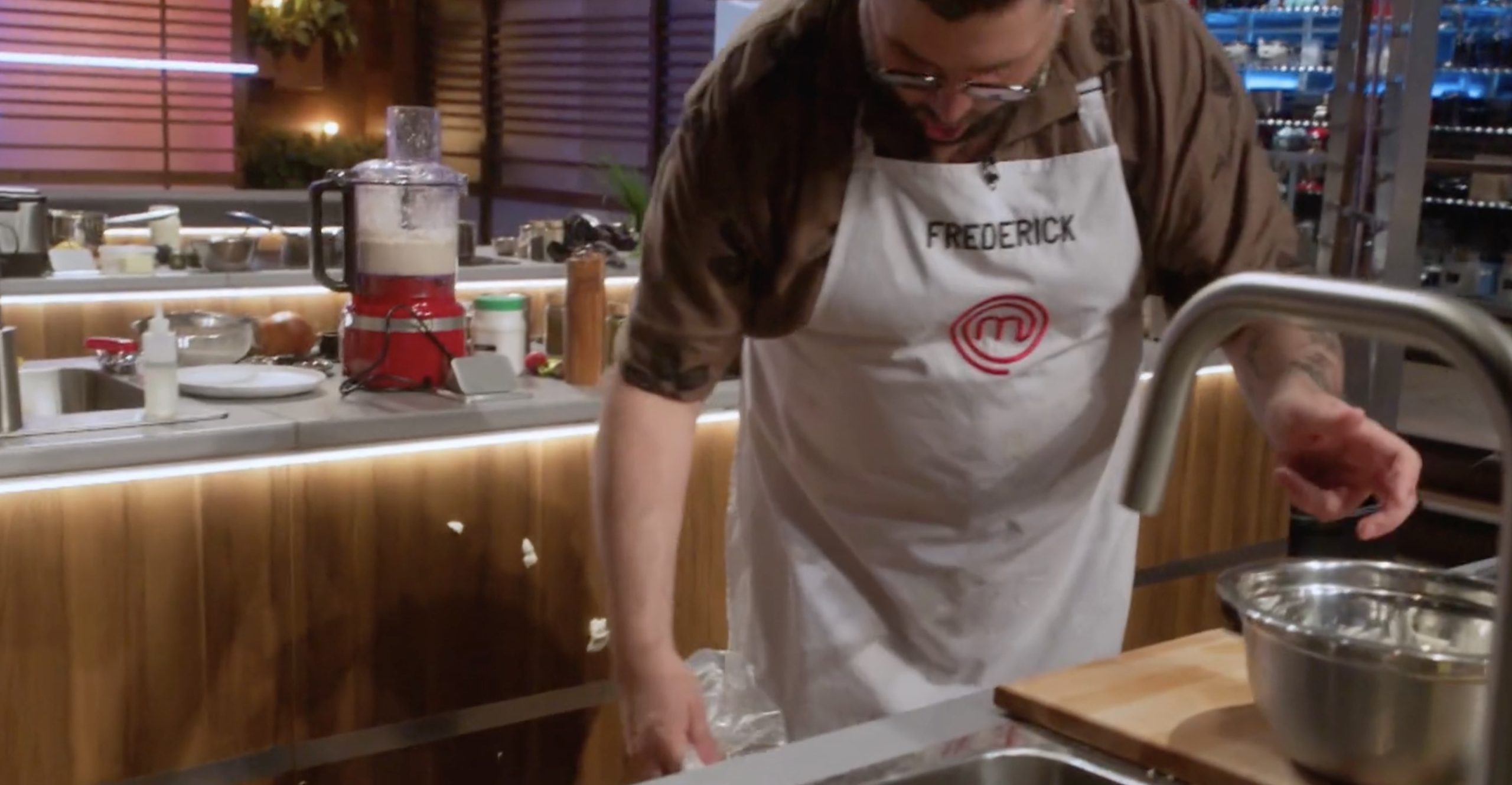 Pendant sa préparation, Frederick termine sa crème au mascarpone, la verse dans une poche à douille et commence à la taper doucement sur ses jambes pour bien la tasser… Mais soudain, la douille éclate, projetant la crème partout et provoquant un véritable désastre cocasse.